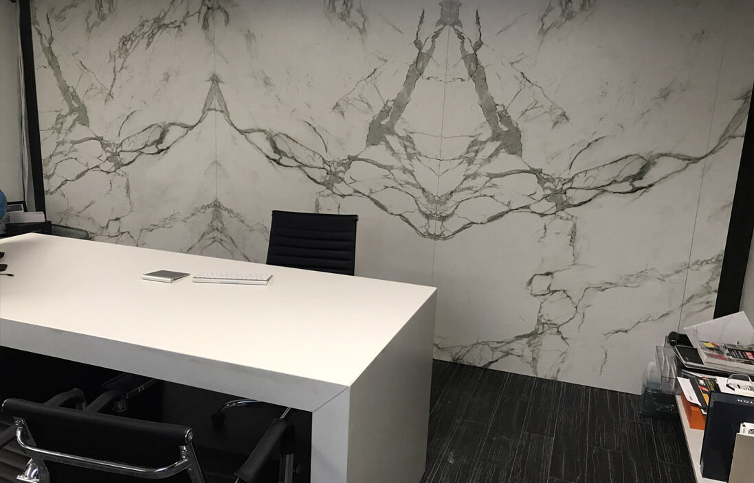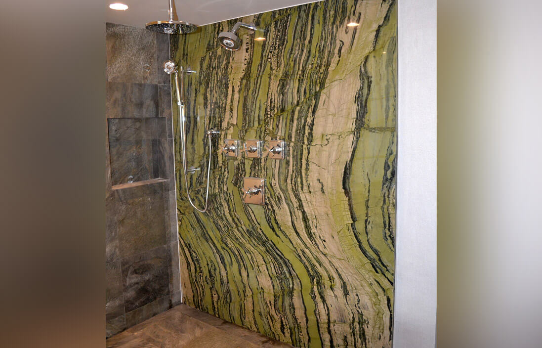 One of the biggest advantages of using solid slabs for walls is the reduction in grout joints that typically encountered with a tile installation. Let our experienced staff to template your space and custom cut your walls for you from quarried stone or engineered materials. Nothing compares to the elegance of a "book-matched" slabs with designs created from symmetrical veining within the nature stone.